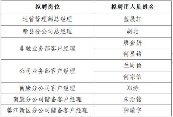 公示期為2023年5月12日至2023年5月17日,公示期間如有異議,請于2023年5月17日17:00前向贛州市融資擔保集團有限公司黨群工作部(人力資源部)口頭或書面反映,聯系方式:郵箱jsydbrsb@163.com,電話0797-8198816。