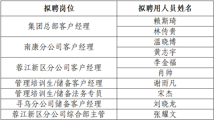 根據(jù)集團(tuán)公司招聘公告的相關(guān)規(guī)定和程序,經(jīng)過報名、資格審查、筆試、面試、體檢與背景調(diào)查等程序,經(jīng)研究,確定以下擬聘用人員,現(xiàn)進(jìn)行公示。